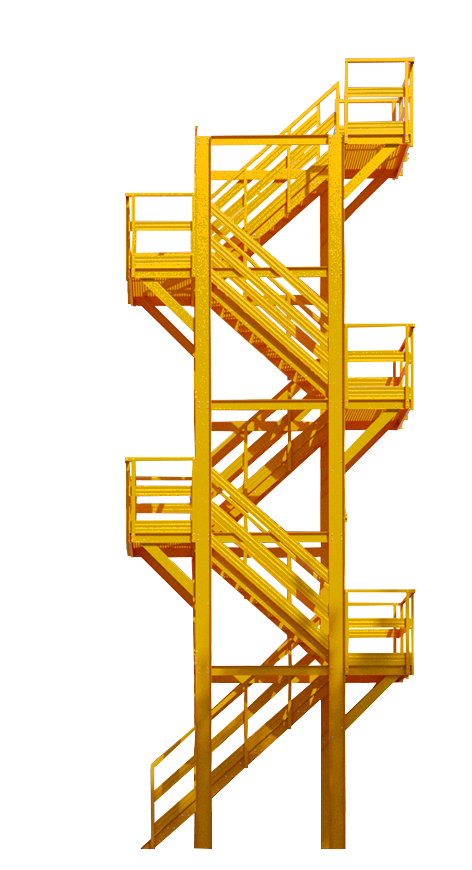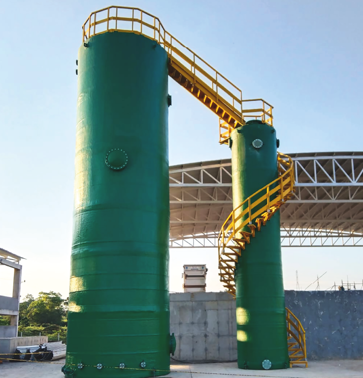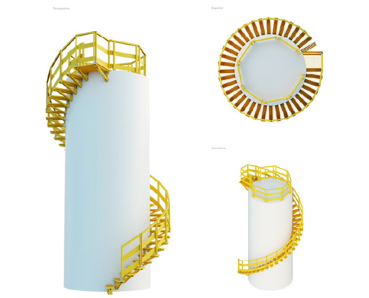 Diseño y la fabricación de escaleras tipo caracol y pasarelas de tránsito entre tanques, perfectas para optimizar los espacios y garantizar un acceso seguro y eficiente. La estructura cuenta con barandas perimetrales que aseguran la estabilidad y protección.